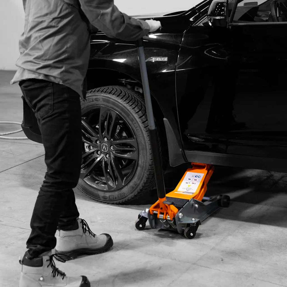 Our 2-Ton Professional Floor Jack’s low-profile design allows to roll it under as little as 2 15/16" of clearance. The protective sleeve along the lifting arm and the rubber-padded saddle will prevent damaging the vehicle when pumping. When your work is done, simply pull and twist the handle counterclockwise for a smooth lowering. This 2-step sequence makes this hydraulic floor jack safer to use in a busy working environment.