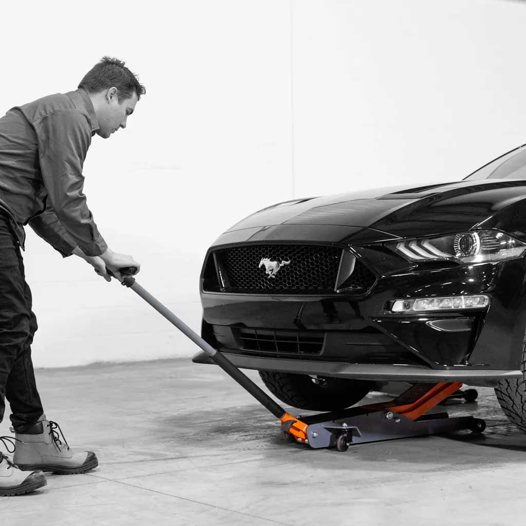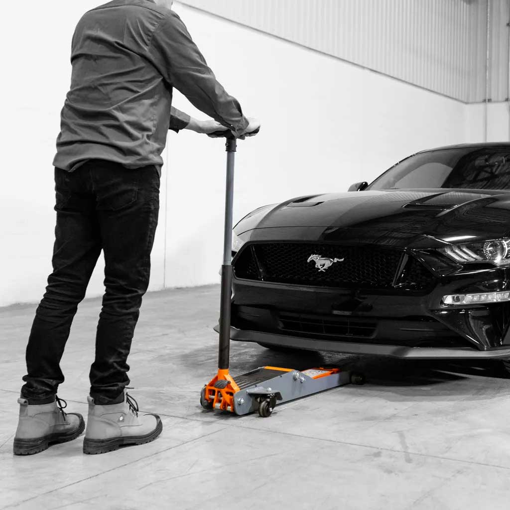 The 2-ton professional floor jack's low-profile and elongated design allows it to roll under 2-15/16″ of ground clearance and easily reach the vehicle's front or rear central jacking point. The protective sleeve along the lifting arm and the rubber-padded saddle will prevent damaging the vehicle when pumping. When your work is done, simply pull and twist the handle counterclockwise for a smooth lowering. This 2-step sequence makes this hydraulic floor jack safer to use in a busy working environment.