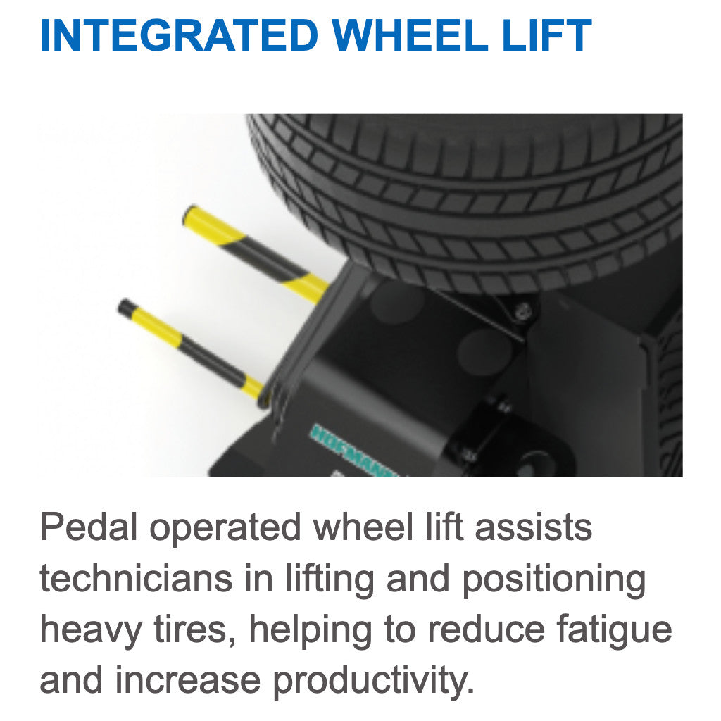 Integrated Wheel Lift: Pedal operated wheel lift assists technicians in lifting and positioning heavy tires, helping to reduce fatigue and increase productivity.