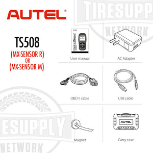 - MaxiTPMS TS508 Tool (Head Unit, OBDII Cable, Charging Cord, User Manual, Carry Case, Magnet)
