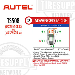 - Two TPMS Service Modes: The TS508 is a new generation complete TPMS tool that offers the option to choose one of two service modes from the home screen, to provide faster and smarter TPMS repairs. Based on the TPMS service type needed, the option to choose the basic Quick Mode or the complete Advanced Mode will decrease repair time.